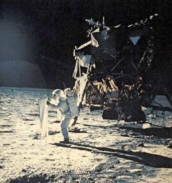der Mondfähre Eagle landeten die beiden ameri-kanischen Astronauten Armstrong und Aldrin auf