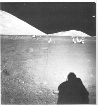 Mondfähre und das Mondauto beim Aufstellen der Experimen te. Der Schatten